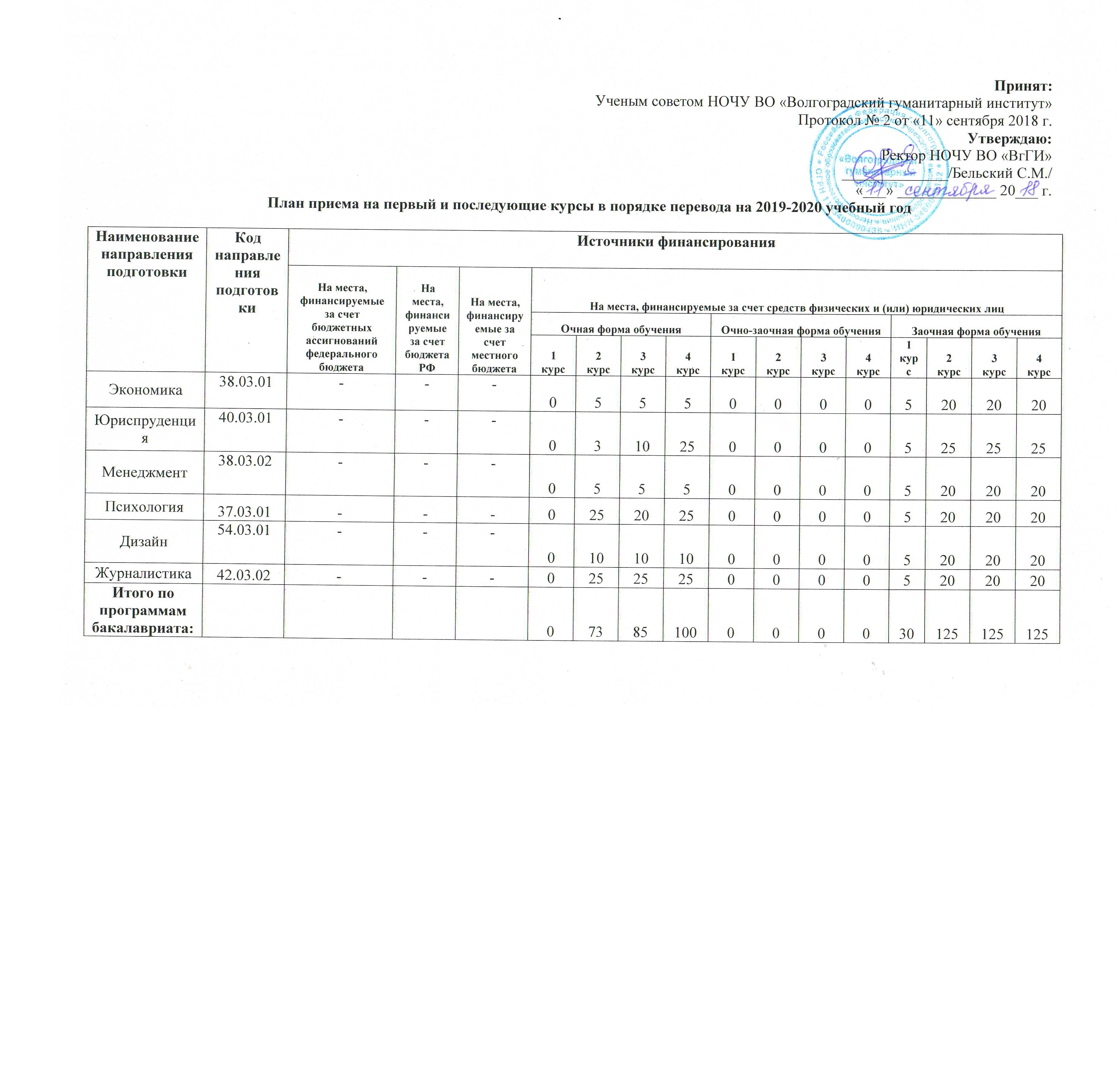 План приема на второй и последующие курсы в порядке перевода на 2020-2021 учебный год