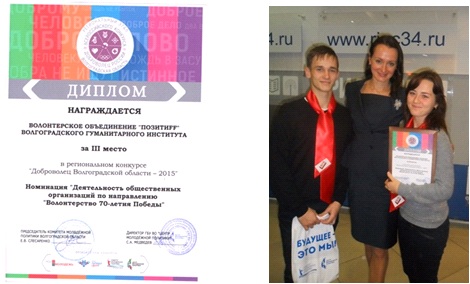 29 октября 2015 года в Волгоградском региональном информационно- аналитическом центе прошло награждение победителей конкурса «Доброволец Волгоградской области – 2015». Исполнительный директор Волгоградского областного благотворительного Фонда социальной поддержки населения – Д. А. Землянский и председатель комитета молодёжной политики Волгоградской области Е. В. Слесаренко – наградили и поздравили 0 в номинации "Деятельность общественных организаций по направлению "Волонтерство 70-летия Победы" нашу волонтерскую команду, занявшую 3 место.